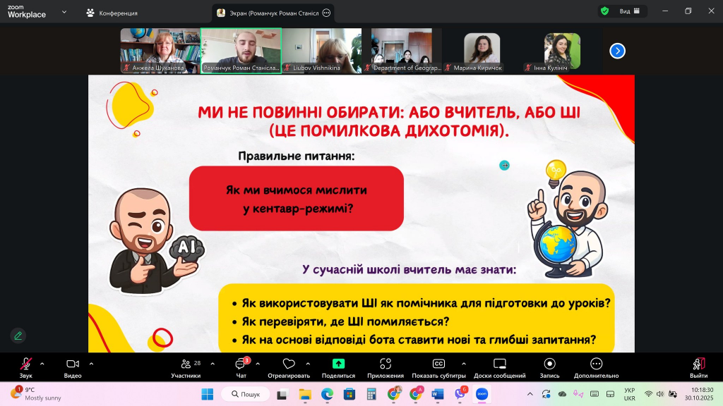30 жовтня 2025 року на кафедрі географії, методики її навчання та туризму Полтавського національного педагогічного університету імені В. Г. Короленка відбулася гостьова лекція випускника нашої кафедри Романа Станіславовича Романчука на тему: «Штучний інтелект у навчанні географії — сучасні погляди та перспективи».