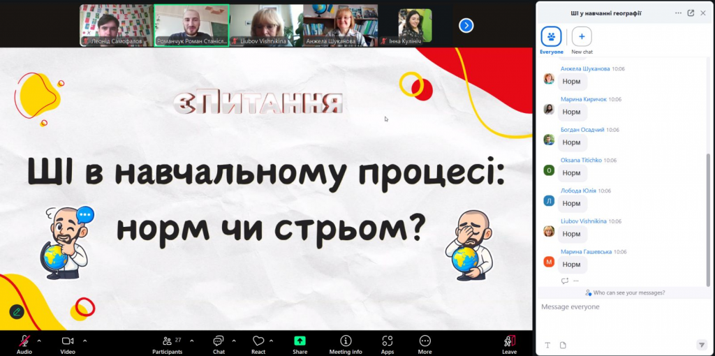 Зустріч з Романом Станіславовичем стане новим кроком у формуванні професійної компетентності як майбутніх учителів географії, так і фахівців з туризму, оскільки вони отримали практичні рекомендації до правильного написання промптів. Він поділився туторіалами створення інтерактивів у вигляді вебсайтів. Під час лекції відбулося обговорення морально-етичних питань, пов’язаних із застосування ШІ в освітньому процесі в середньої і вищої освіти.