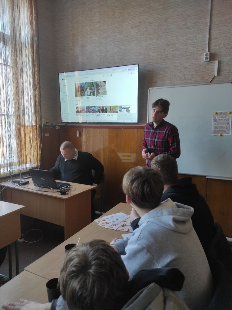 Старший викладач кафедри Сергій Сарнавський та здобувачі освітньої програми «Середня освіта (Географія)») Олександр Кибкало і «Туризм та рекреація» Катерина Федотова представили відео та захоплююче розповіли про студентські практики, які проходили у різних куточках України, ознайомили з особливостями майбутніх професій вчителя географії і фахівця з туризму та рекреації.