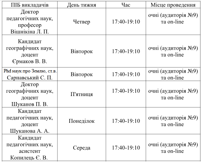 Графік консультацій викладачів кафедри географії, методики її навчання та туризму для студентів малокомплектних груп на 2025-2026 н.р.