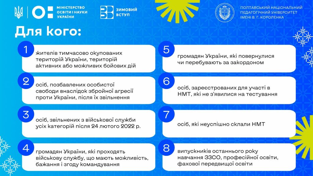 Полтавський національний педагогічний університет імені В. Г. Короленка відкриває набір на нульовий курс у межах експериментального проєкту «Зимовий вступ». Це коротка підготовча програма перед вступом на перший курс, яка допомагає системно підготуватися до НМТ та адаптуватись до освітнього процесу в університеті.